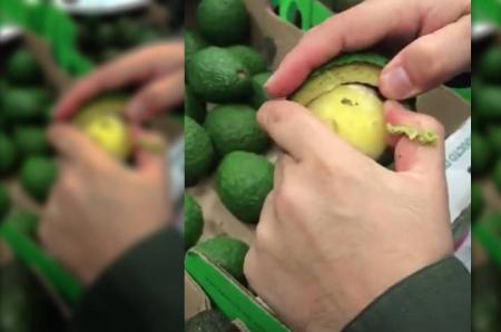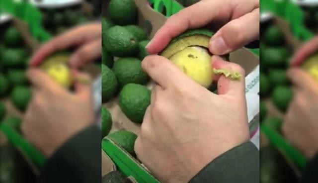 En un video difundido por la Policía, se observa cómo uno de los agentes abre un aguacate y al interior de la pepa se encuentra con un empaque con una sustancia.