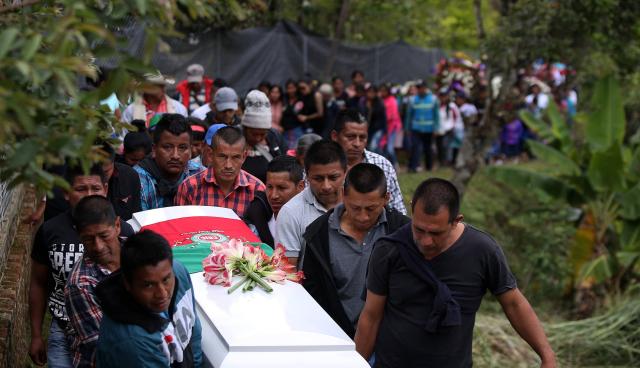 En medio de aplausos, música y lágrimas, fueron trasladados lois cuerpos de los cinco indígenas asesinados en Tacueyó, Cauca. Foto: Juan Pablo Rueda / EL TIEMPO