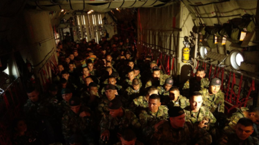 Efectivos militares se preparan en la madrugada para salir de Bogotá hacia Tolemaida.
