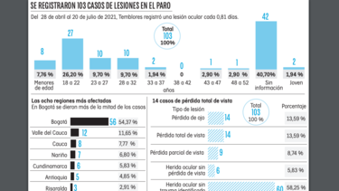 Según los registros de la plataforma Grita de Temblores, desde el 28 de abril hasta el 20 de julio de 2021 hubo al menos 103 casos de lesiones oculares, es decir, cada 0,81 días hubo una afectación de este tipo en el contexto del paro.