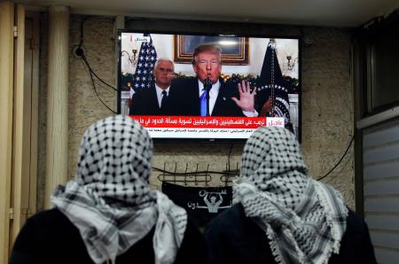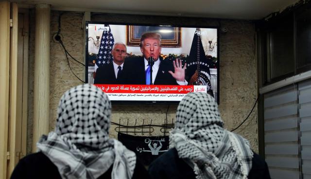 Palestinos observaban este miércoles la transmisión del presidente Donald Trump, de Estados Unidos, sobre el reconocimiento de Jerusalén.